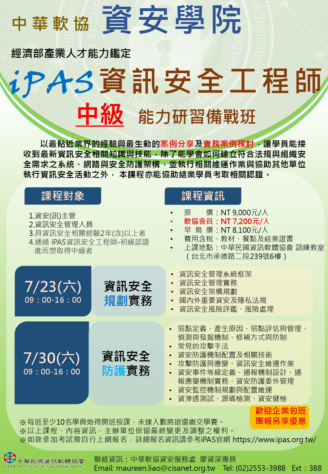 【資安學院】7/23、7/30 iPAS-「中級」資訊安全工程師-能力研習備戰班(已開班)