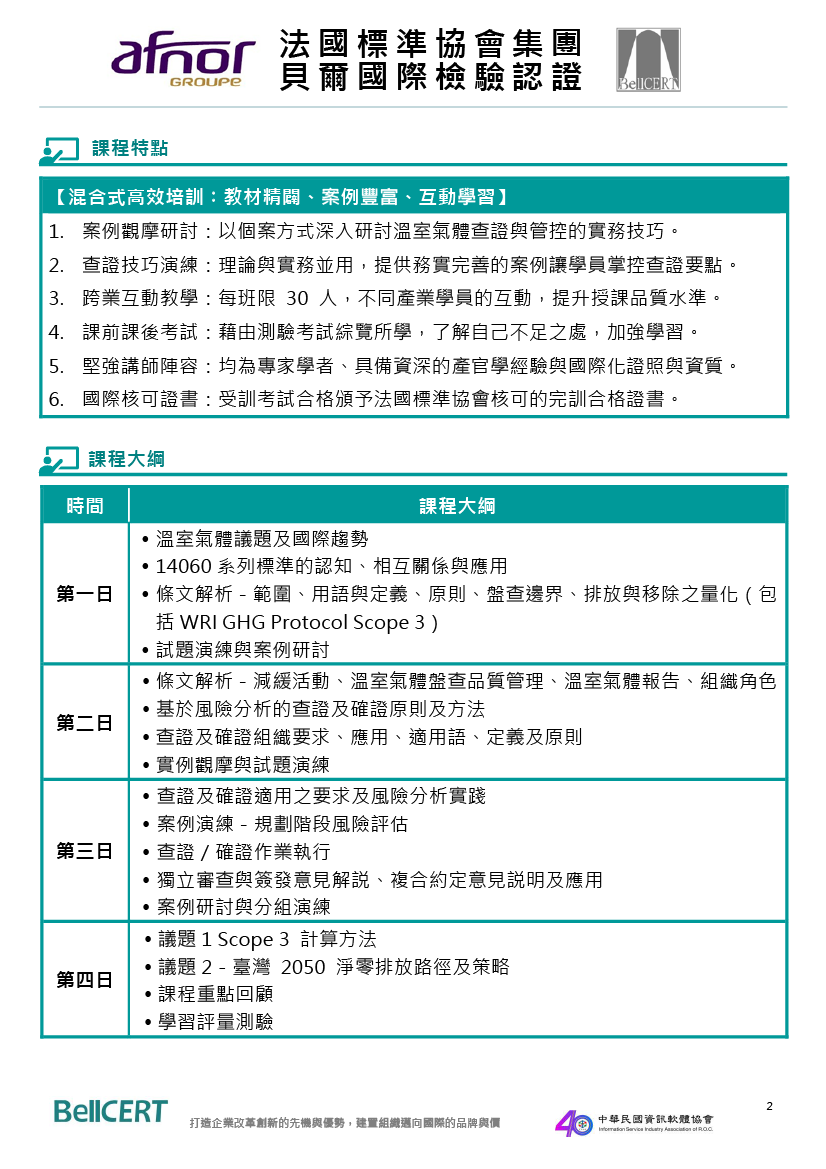 課程涵蓋 14064-1、14064-2、14064-3標準認知、溫室氣體盤查方法與技術、最新碳排查證實務介紹,建立最全面溫室氣體管理與查證的必備專業!