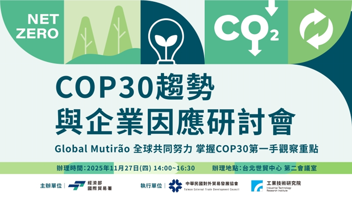本次活動邀請了實地前往巴西參與COP30的李堅明教授進行第一手重點趨勢分析,並邀請國內企業代表分享如何應對氣候變化衝擊及剖析企業減碳策略,期能協助企業掌握國際永續脈動與建立因應策略,強化出口競爭力。